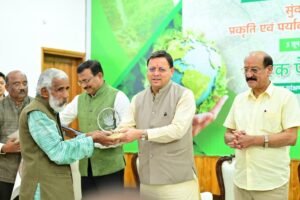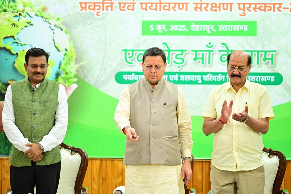 मुख्यमंत्री धामिन आज मुख्यमंत्रि अवास मुख्यमंत्री सेवक सदन म विश्व पर्यावरण दिवस कु मौका पर पर्यावरण तोकम काम करण वला लोगु तै सम्मानित कायी।